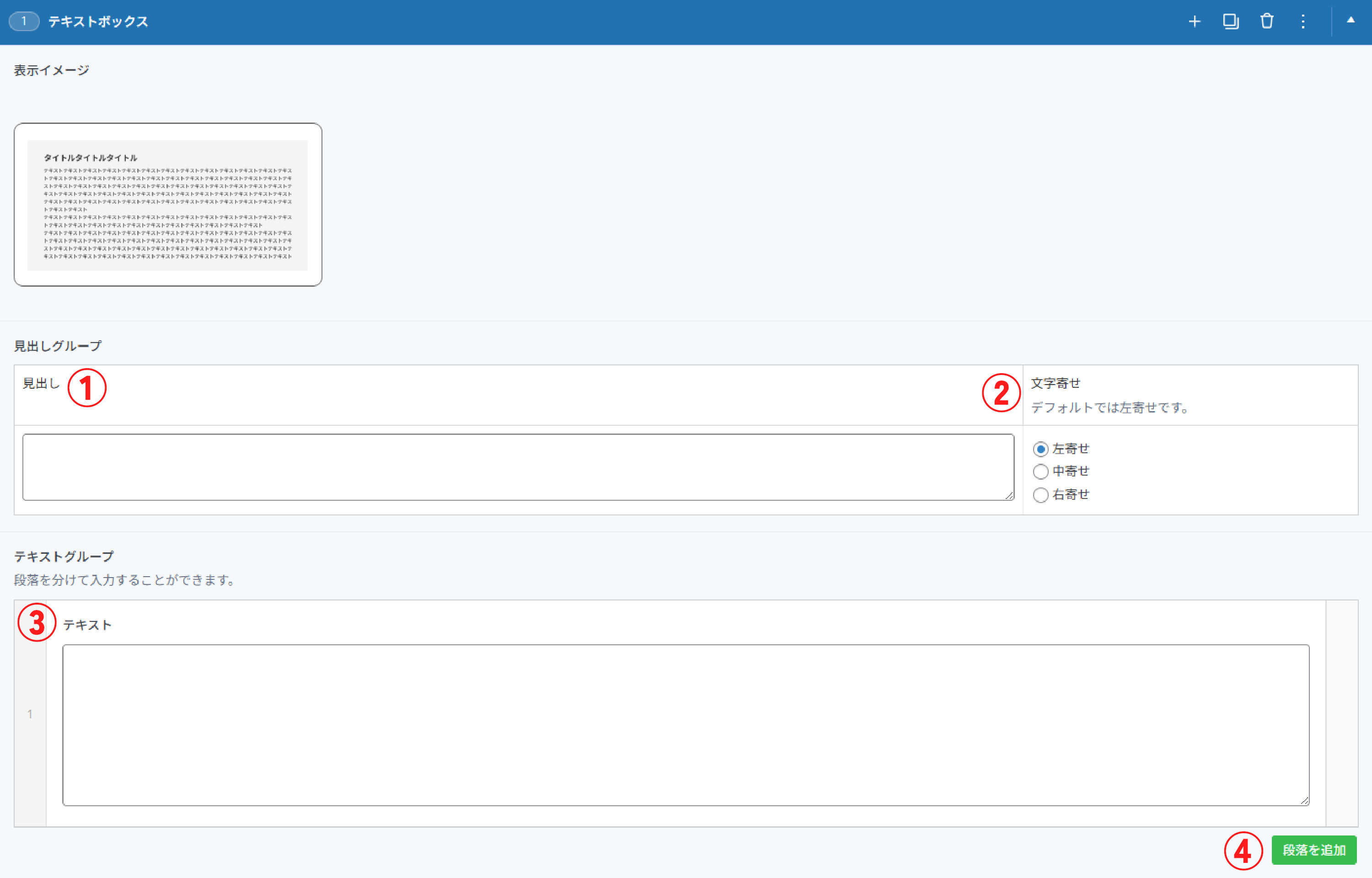 直前のテキストとの間に適切な余白(段落)が自動的に生成されるため、文章の区切りやまとまりごとに使用してください。