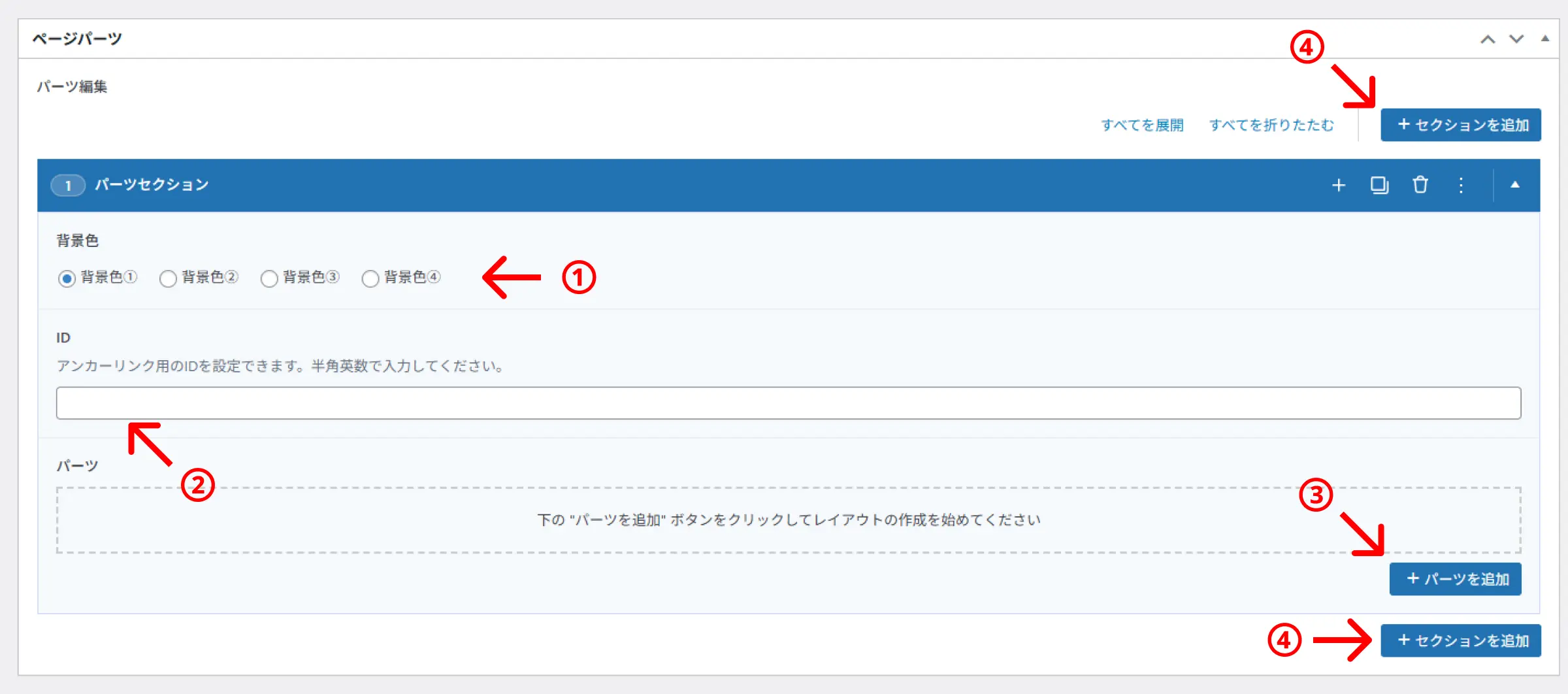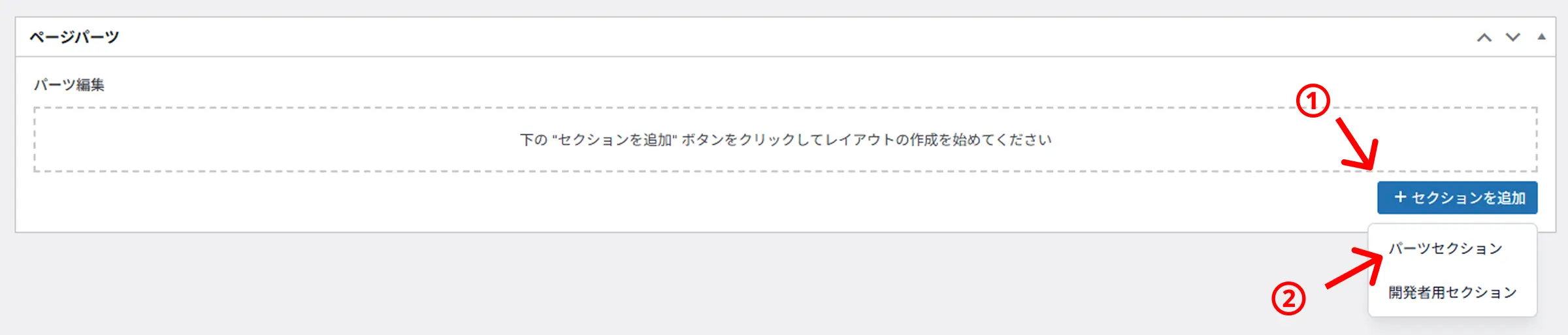①「ページパーツ」の右下にある「セクションを追加」をクリック